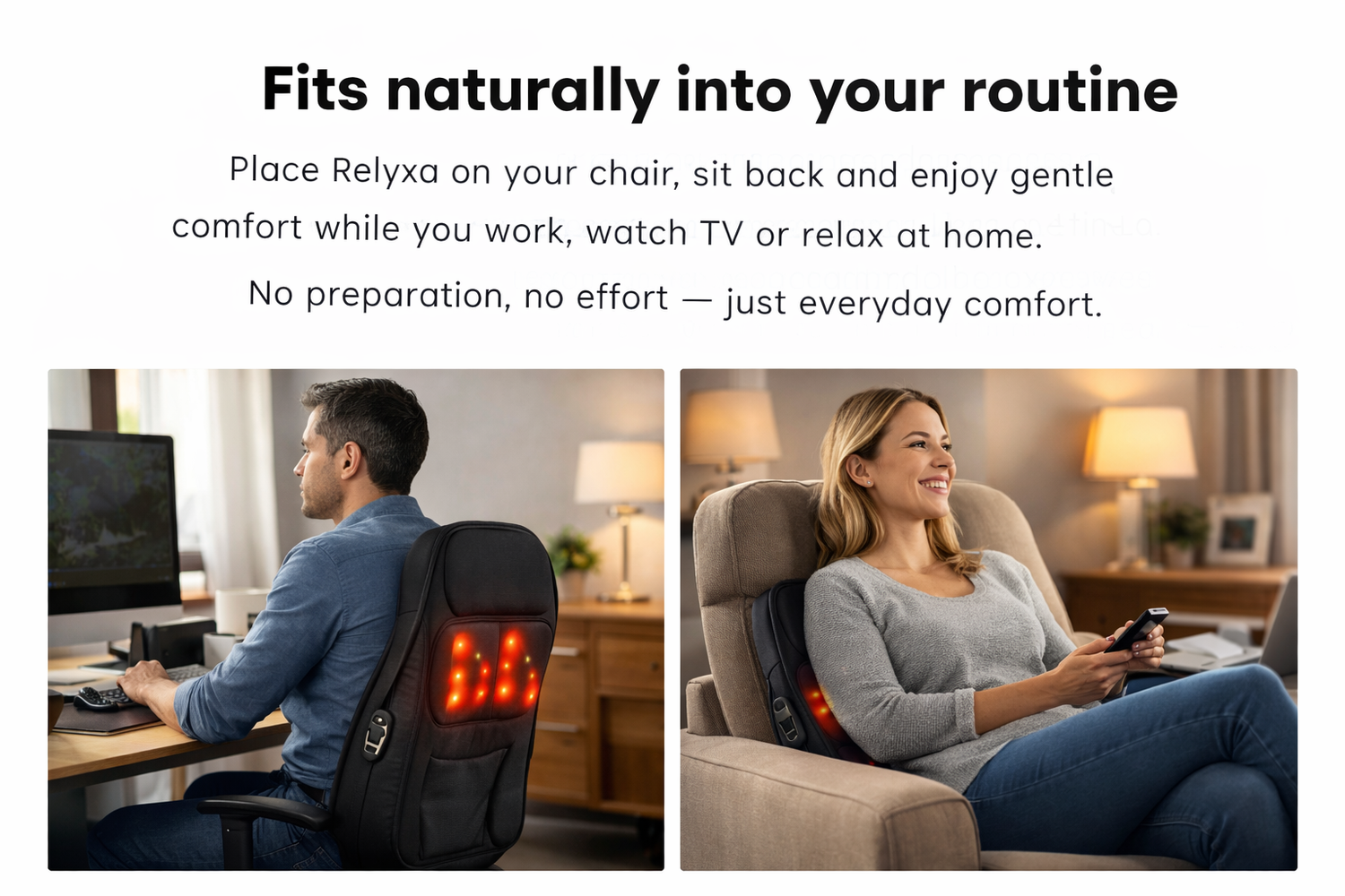 Relyxa is designed to apply these principles in a simple, non-invasive way, making it easy to enjoy everyday comfort while working or resting.