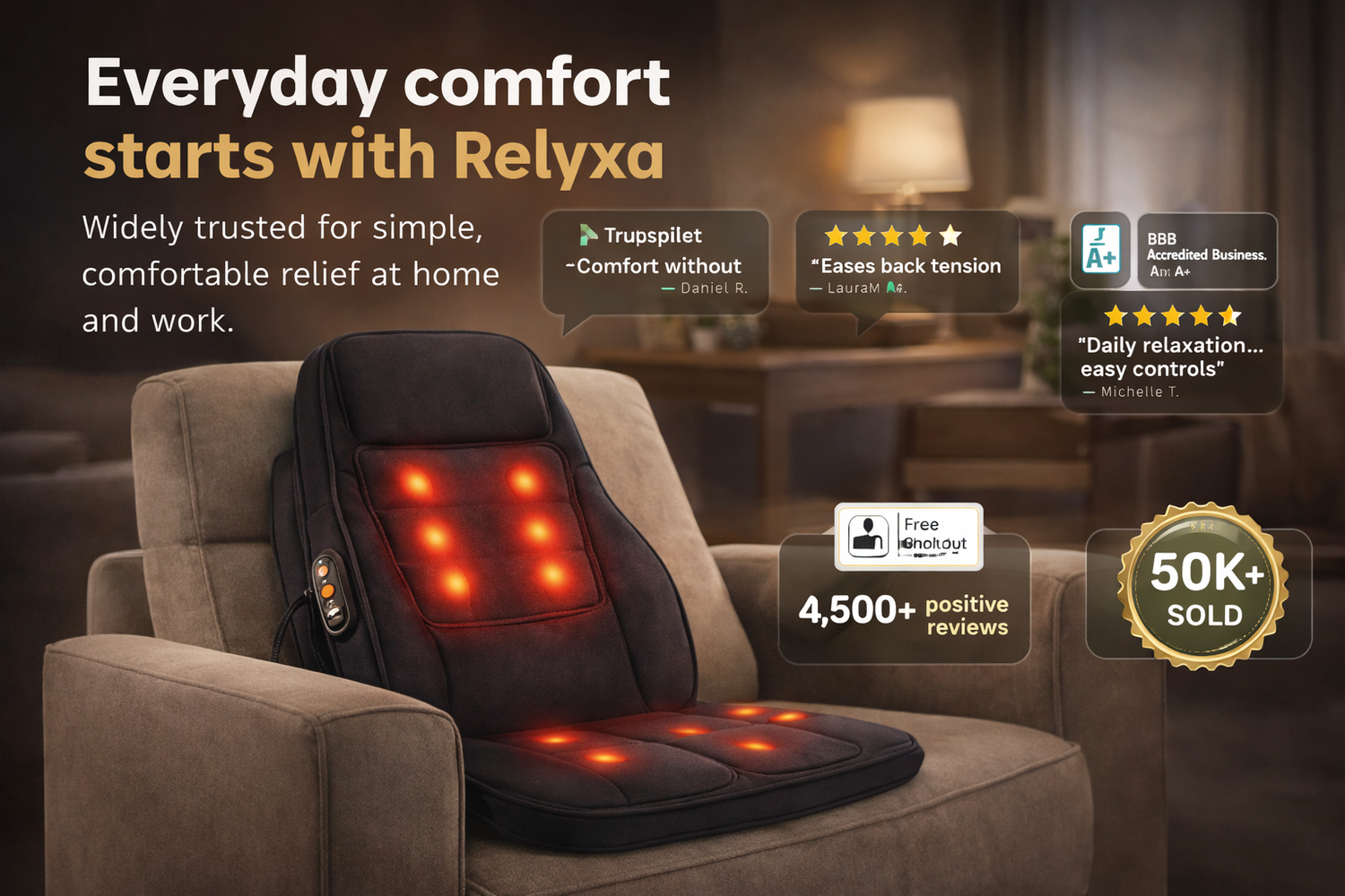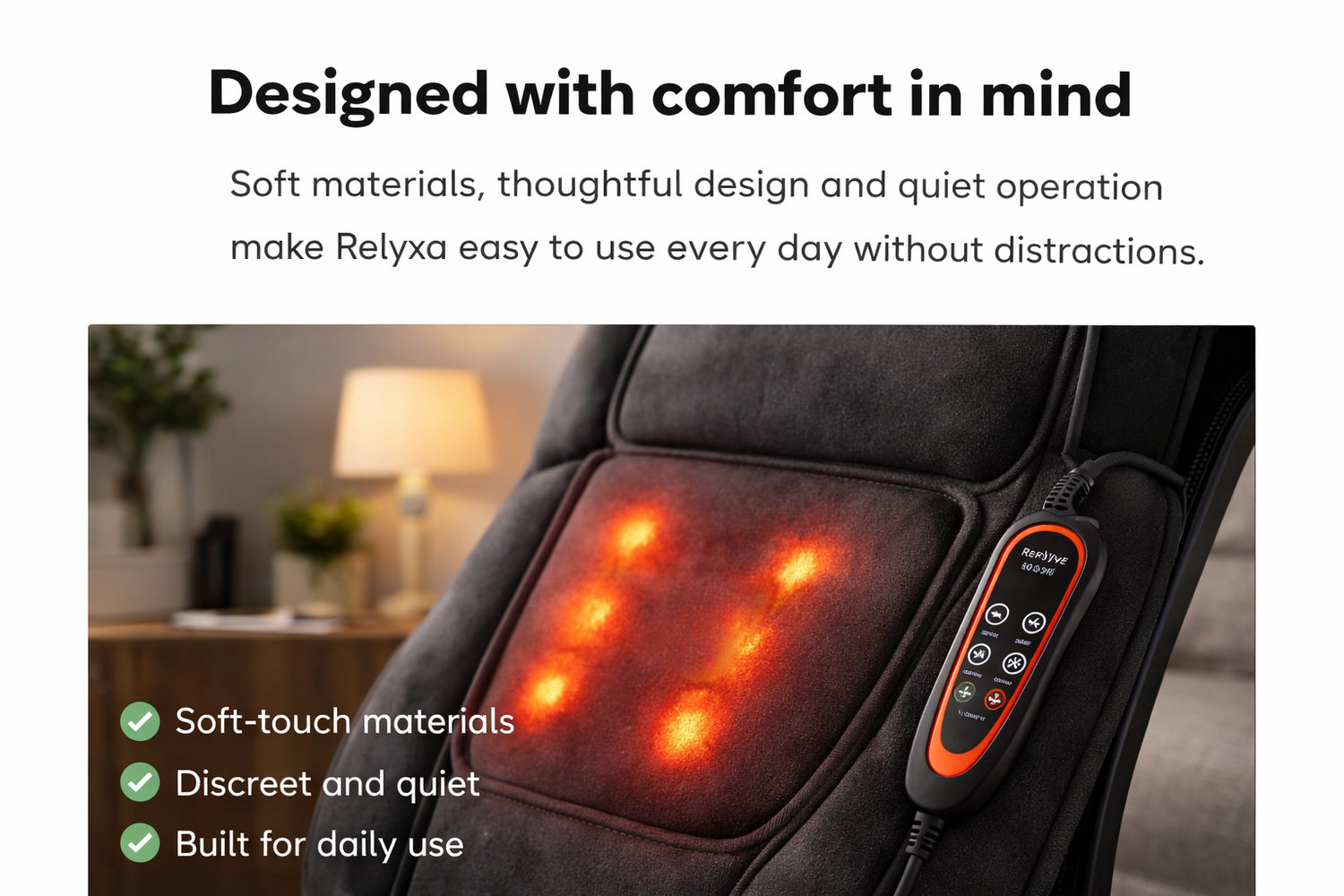 Relyxa is designed to support comfort and relaxation as part of a daily routine, using widely accepted wellness principles such as gentle vibration and warmth.