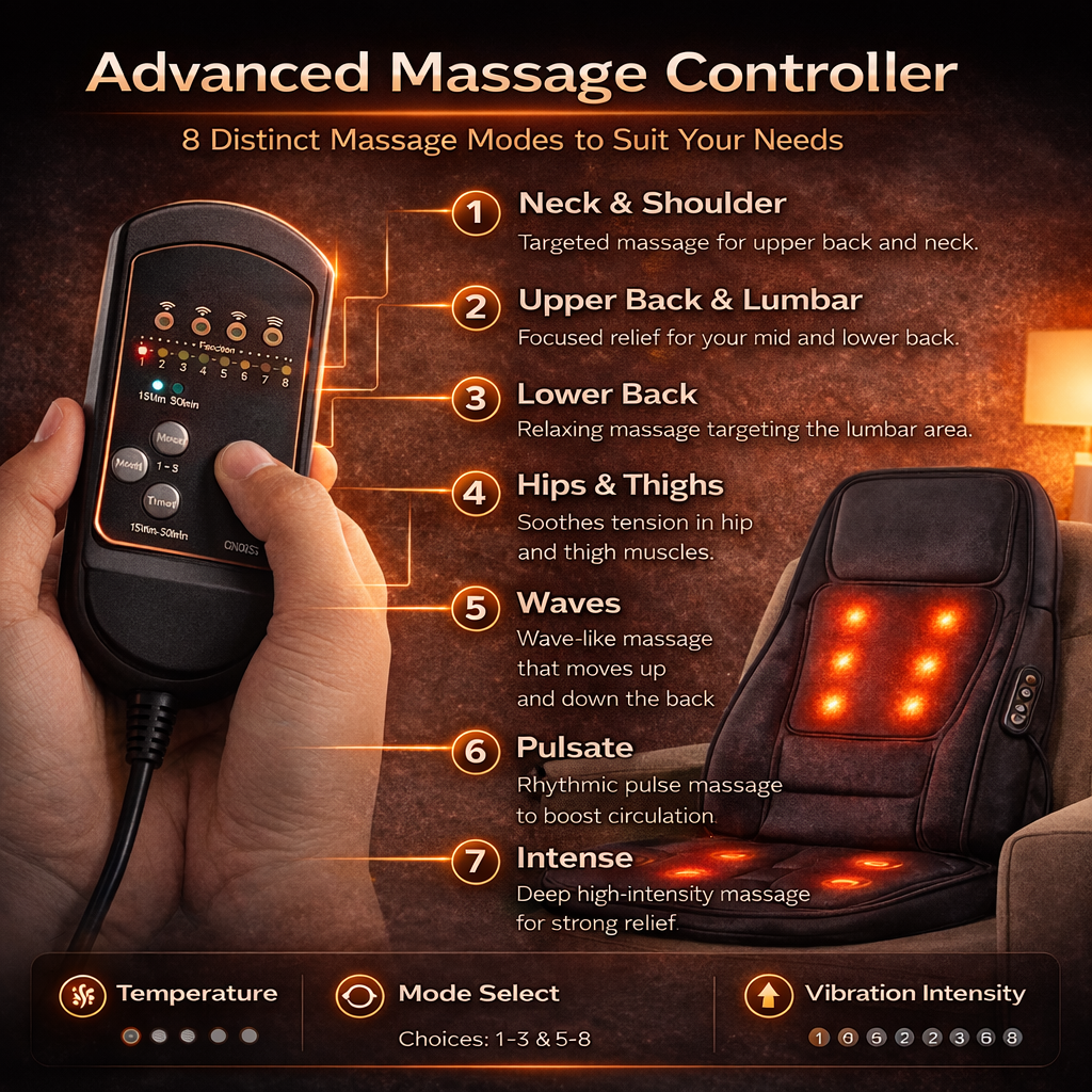 Relyxa’s intuitive controller lets you choose between 8 different massage modes, so you can customize your comfort at any moment.